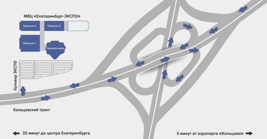 Въезд на территорию МВЦ «Екатеринбург-ЭКСПО» осуществляется с Кольцовского тракта.